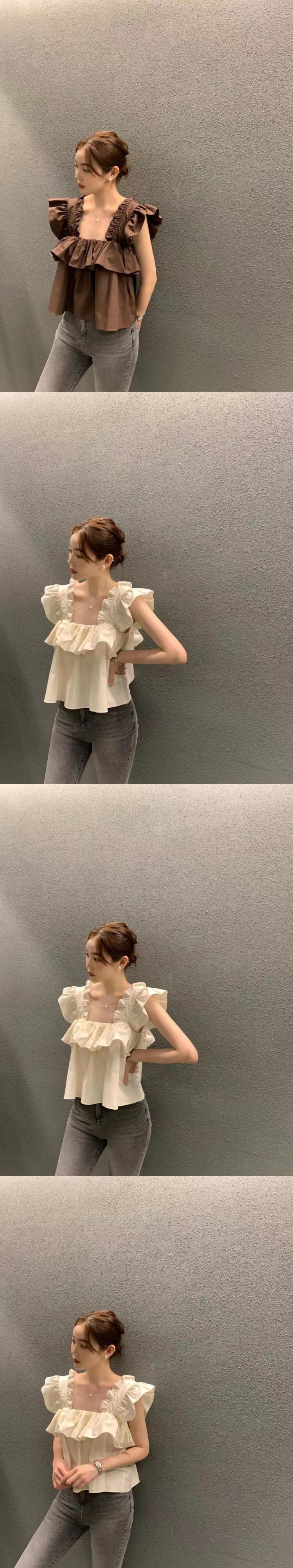夏シャツ甘いフリルスリムフィットブラウススクエアカラーノースリーブクロップトップスデモーダ ラッフル 大人ガーリー スウィート キュート カジュアル サマー 夏物 スクウェア