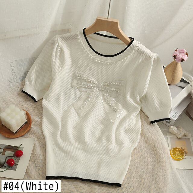 ニット Ropa シャツクロップトップ Y2k 美的グラフィック Tシャツグランジビーズメッシュボウネック半袖トップ ショート リボン ハーフスリーブ