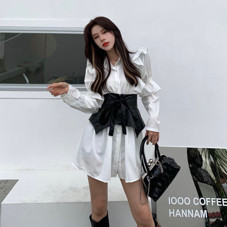 A ライン 春フリル バブル スリーブ ホワイト シャツ ドレス ミニ ウエスト タイ ブラック ベルト 2 点セット レディース 衣装 Y2k スプリング 春物 ハーネス Aライン