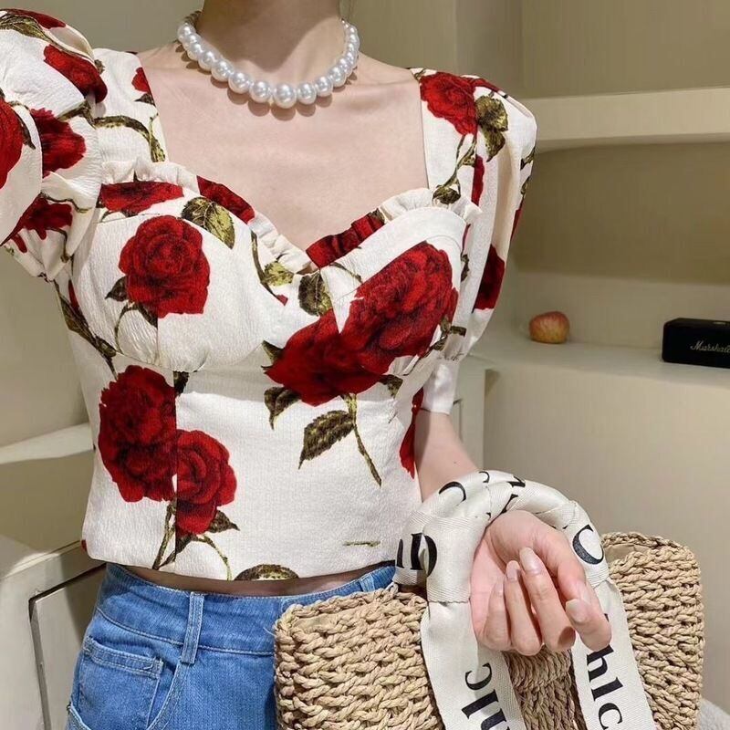 ローズプリントクロップトップセクシーブラウススクエアウエストパフ半袖花柄ブラウスシャツ ショート ハーフスリーブ スクウェア