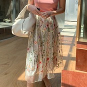 ペチコートスカート A ライン大き裾ウエスト刺繍花スカートロングミディスカート段 Faldas モーダ レッド 花柄 Aライン