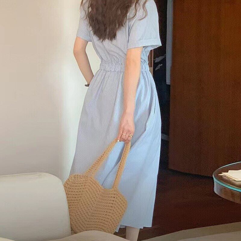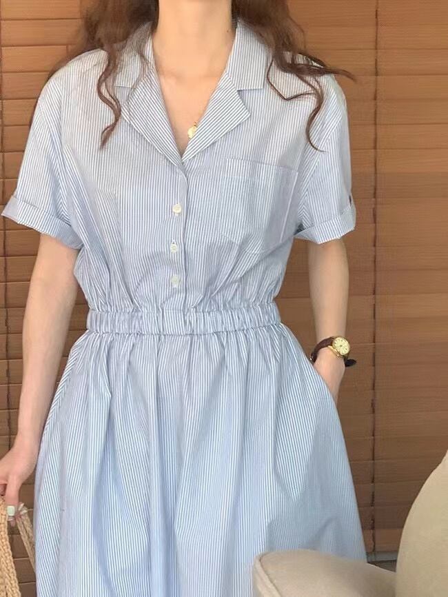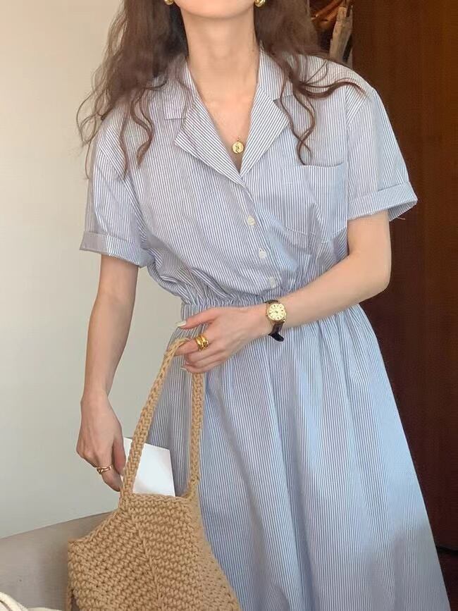 ノッチプリーツウエスト半袖シャツドレス Vestidos 夏ブルーストライプドレス Y2k ローブ ショート ハーフスリーブ サマー 夏物