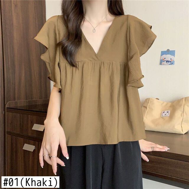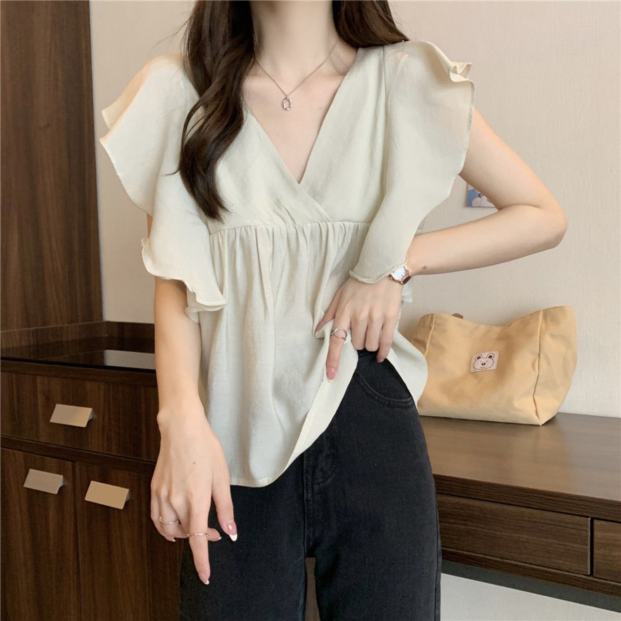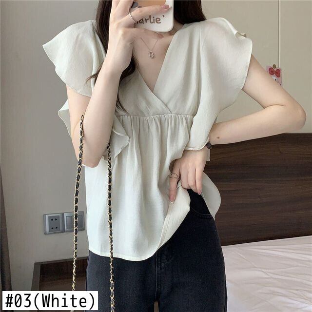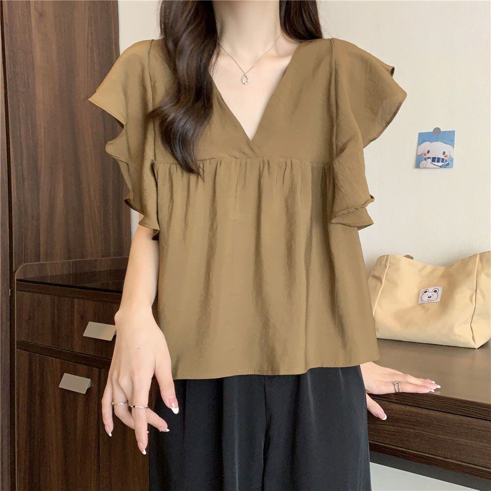 ブラックホワイトカーキルーズセクシーフライングスリーブシャツトップ夏 V ネックシフォンシャツブラウスクロップ サマー 夏物 Vネック