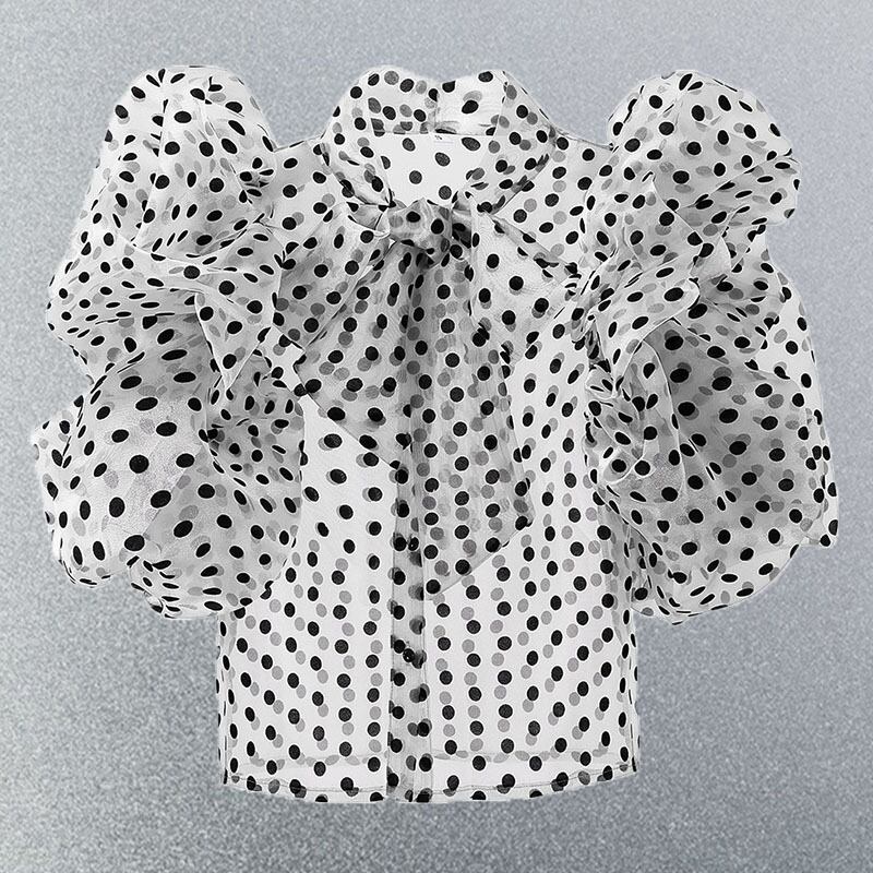 フレンチレトロリボンレースアップバブル半袖オーガンジーブラウス半袖ポルカドットシャツシフォントップシャツ ショート ハーフスリーブ