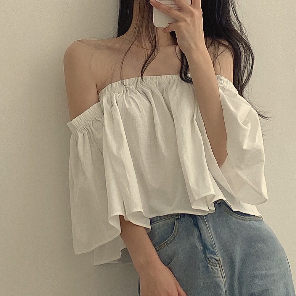 スラッシュネックオフショルダーフレアスリーブストラップレスクロップトップデモーダセクシーブラウスシャツブラックホワイト