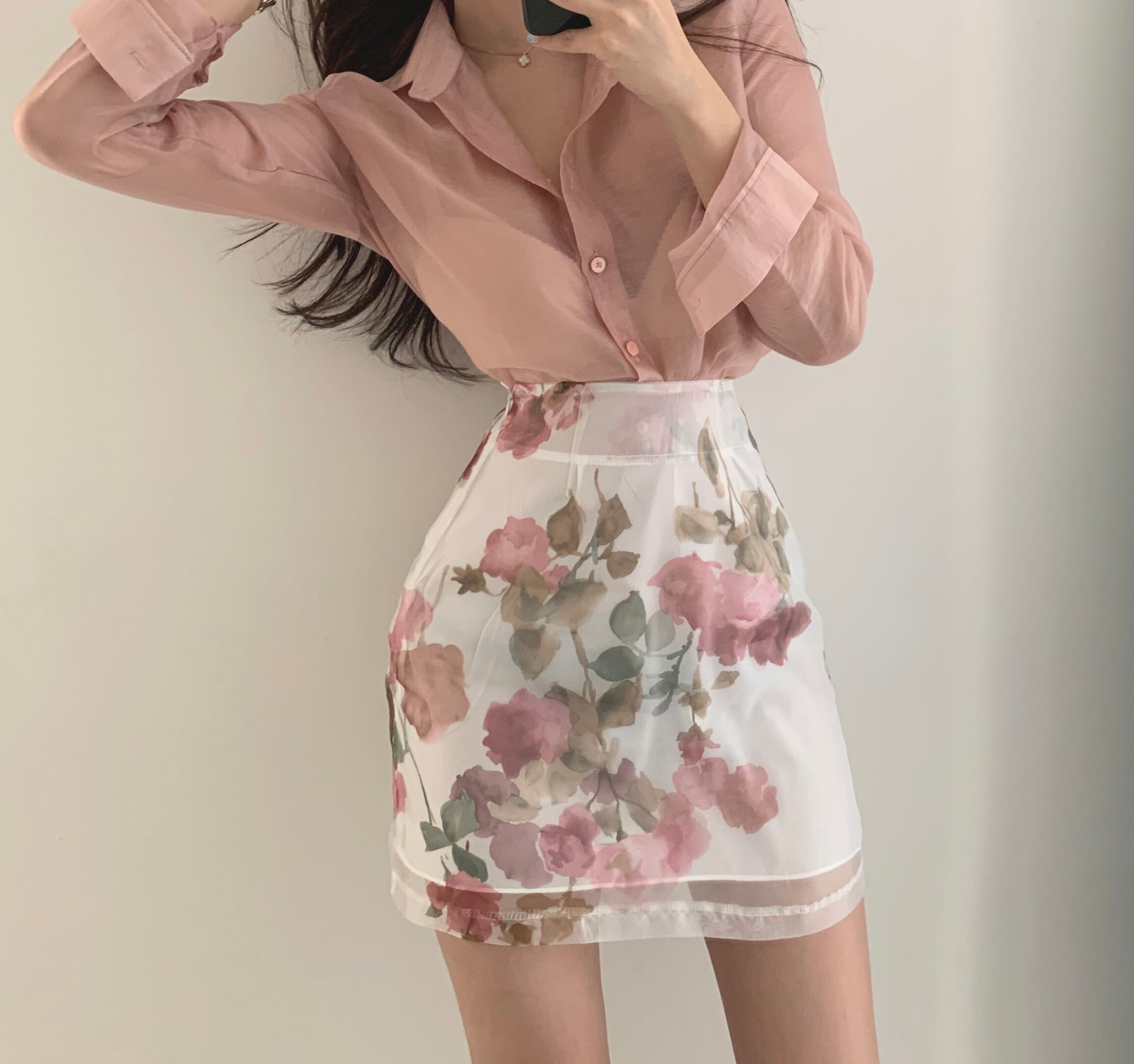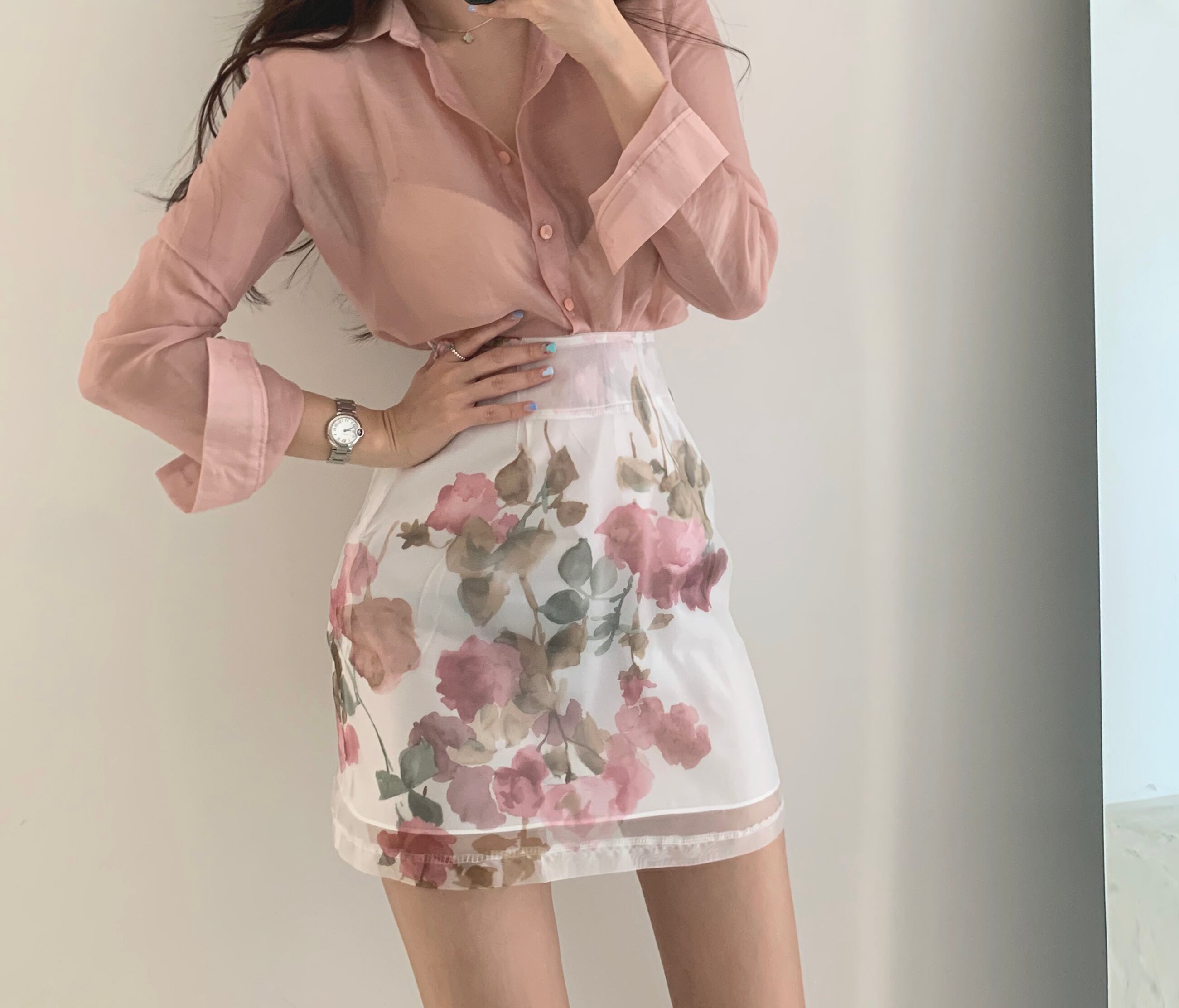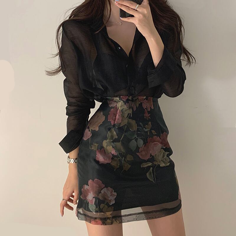 ピンク視点長袖シャツオフィスレディトップウエスト A ライン小さ黒花柄スカート 2 点セットブラウス ロング ブラック Aライン 会社 学校 通勤や通学にも