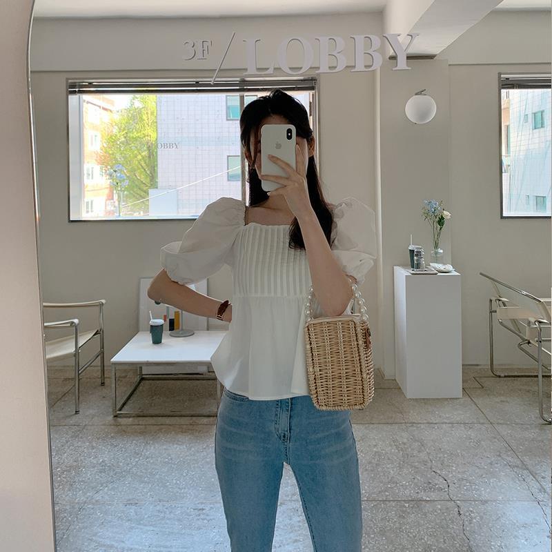 パフスリーブシャツY2kスクエアカラープリーツホワイトブラウスサマーデ 夏物 スクウェア