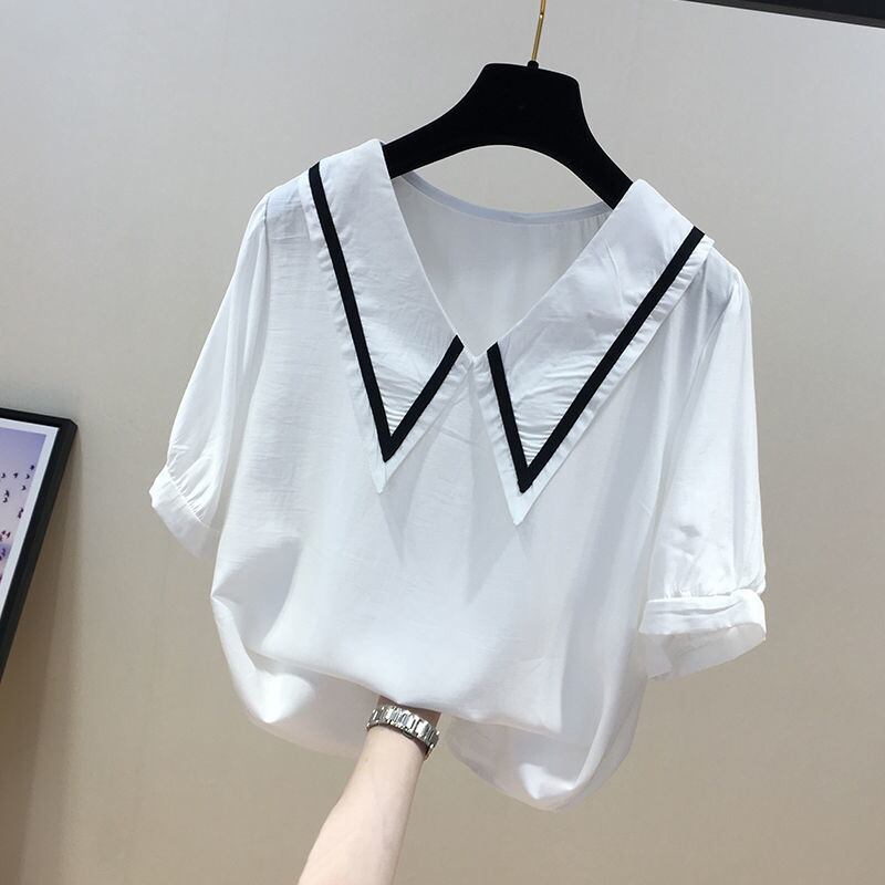 ルーズコントラストカラードール半袖シフォンシャツDe Modaブラックホワイトシャツボタンブラウス ショート ハーフスリーブ
