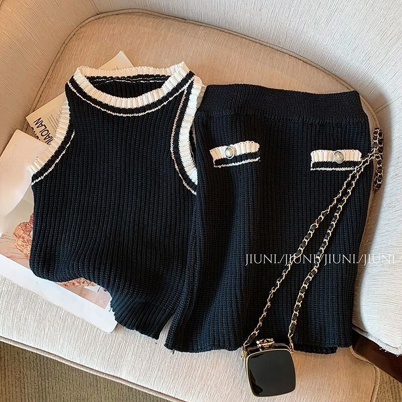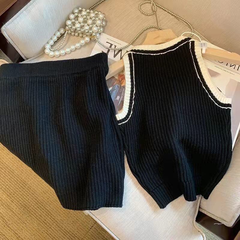 黒キャミソールタンクトップニットウェアスリムワイルドミニスカートセットボディコンドレススーツツーピースセット秋ニットベスト ブラック