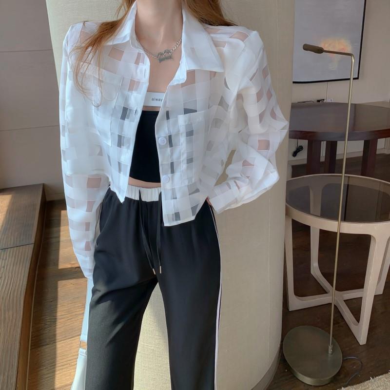 ルーズパースペクティブシャツオーガンザ日焼け止めトップ白シャツ長袖チェック柄ブラウスデモーダ ロング ホワイト