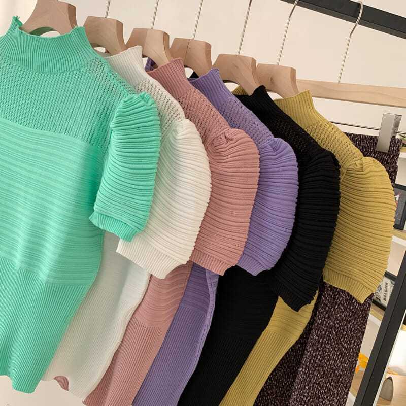 プルオーバーハーフタートルネックニットセーター夏パフ半袖ジャンパーシャツ中空アウト Y2K クロップトップス Tシャツ ショート ハーフスリーブ サマー 夏物 ソリッドカラー
