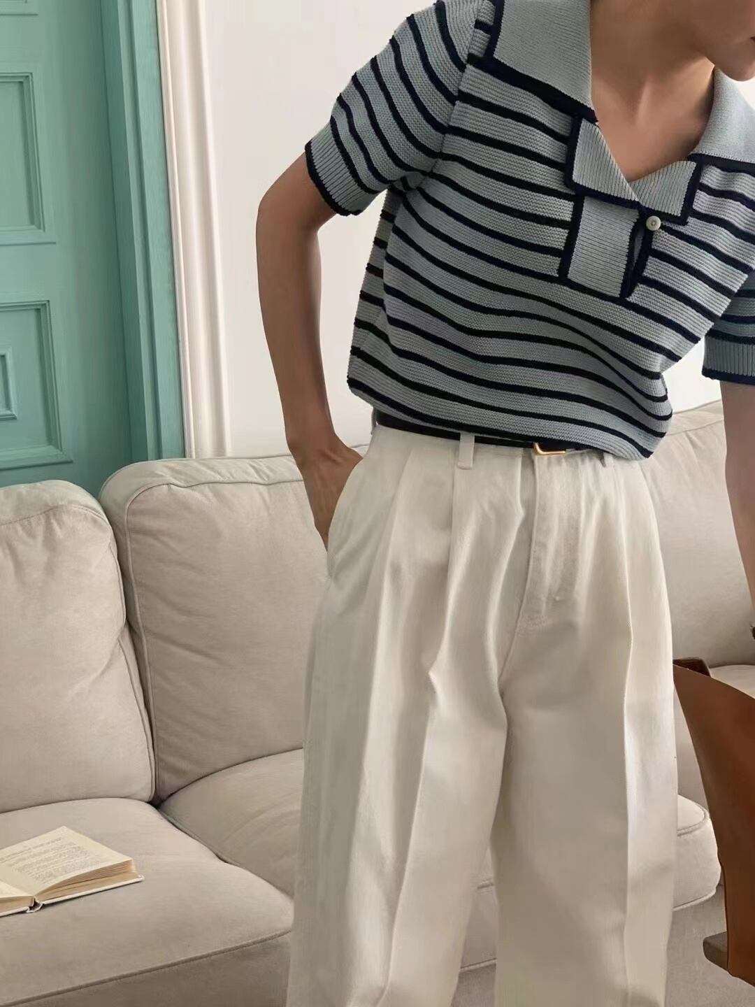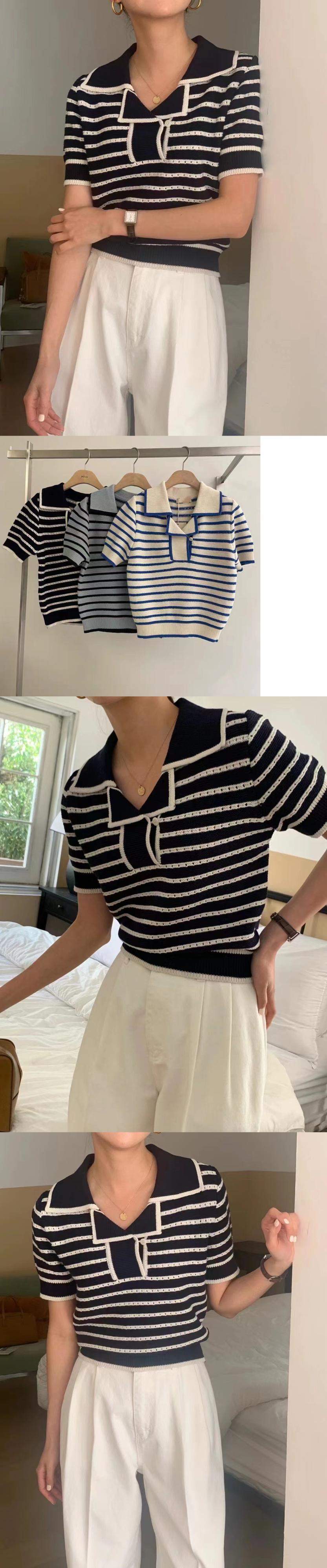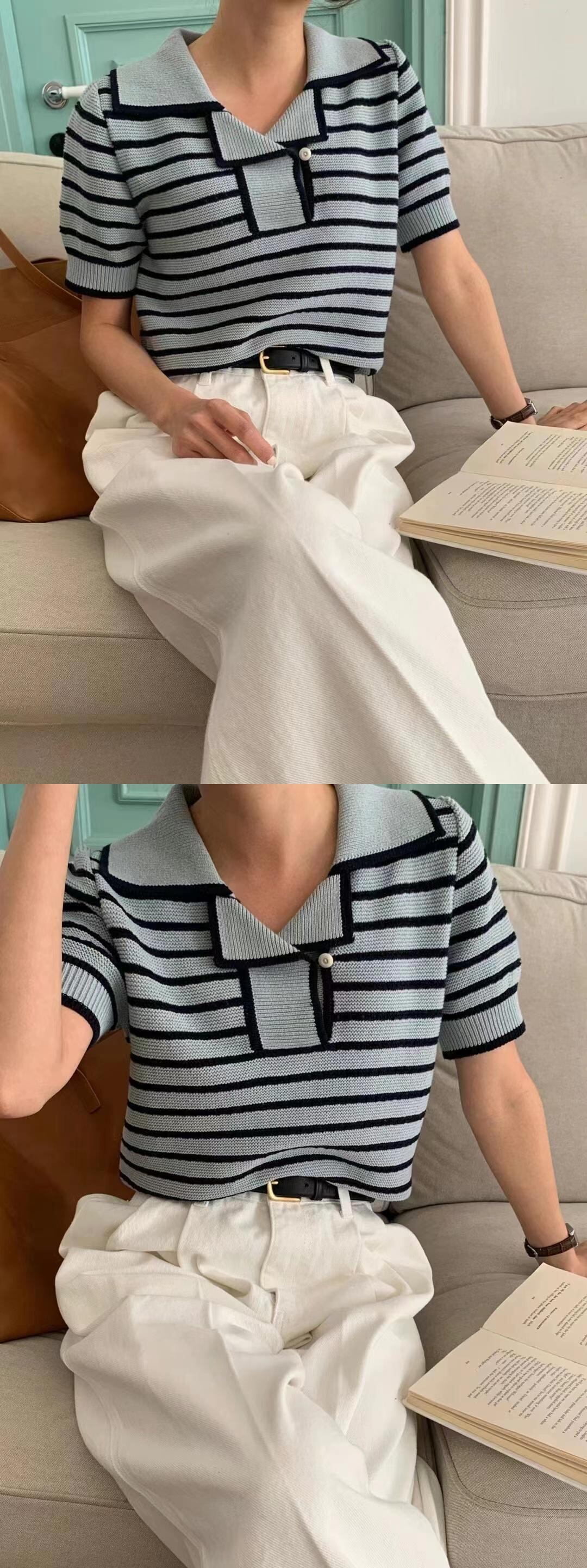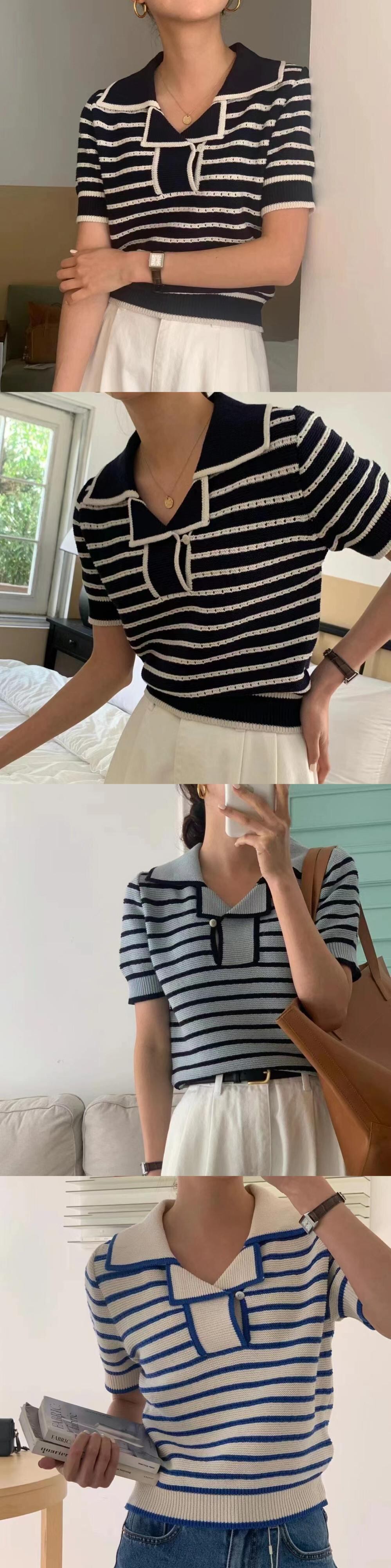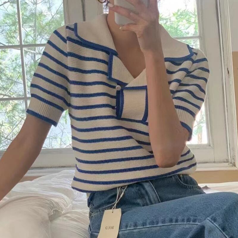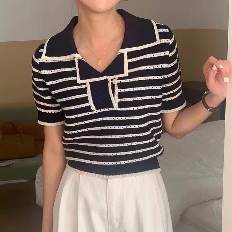 コントラストカラールーズ半袖ストライプニットシャツ Y2k 服セータープルプルオーバートップブラックホワイト ショート ハーフスリーブ