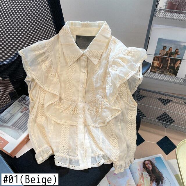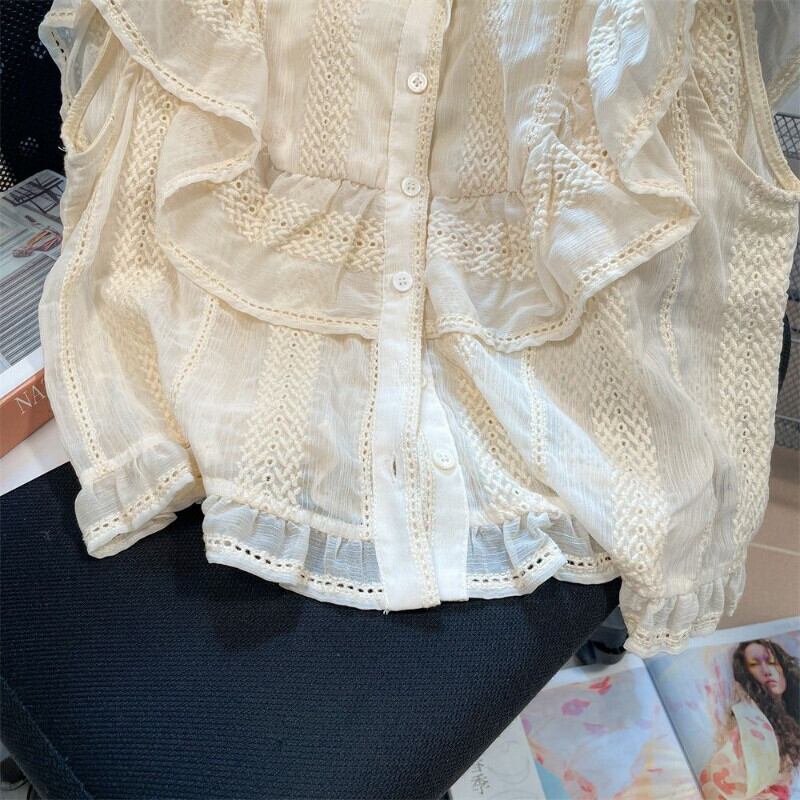スイートパレススタイルフックフラワーブラウスカミーサラペルフリルフライングスリーブクロップトップススリムシャツ レース 大人ガーリー スウィート キュート カジュアル フラワーデザイン