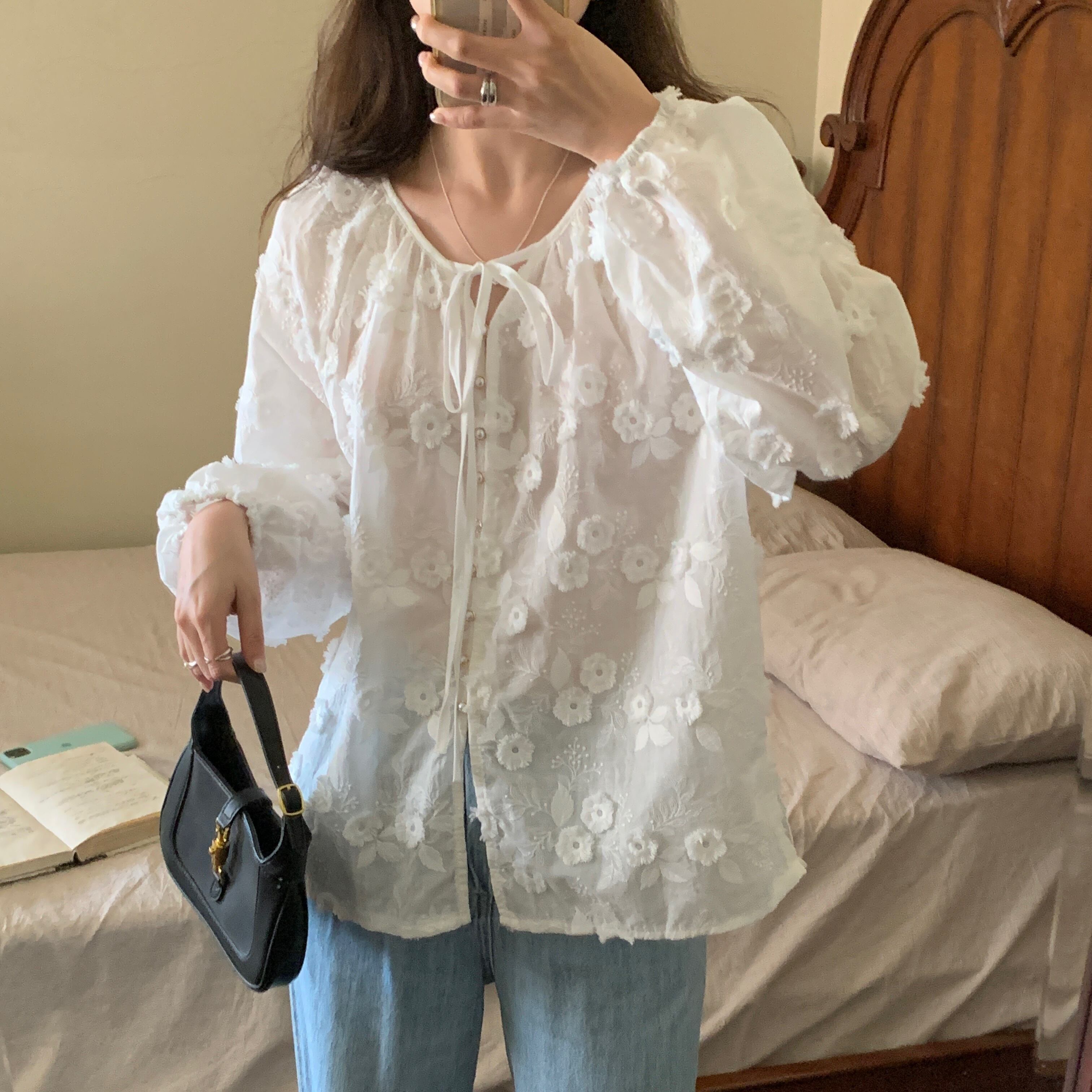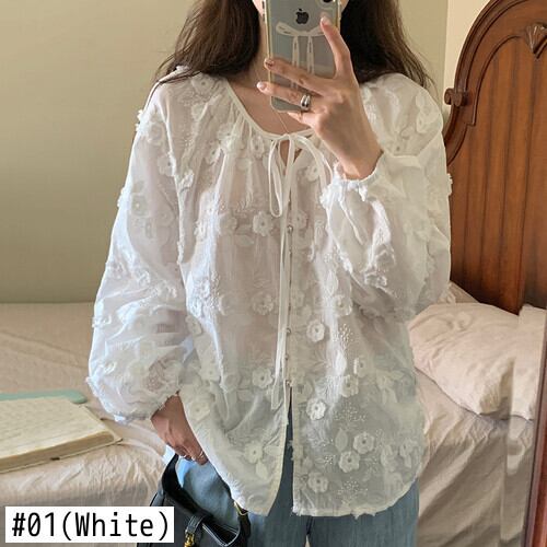 De Moda レースアップリボン立体フラワーシャツルーズ刺繍トップス白シャツパフ ホワイト フラワーデザイン