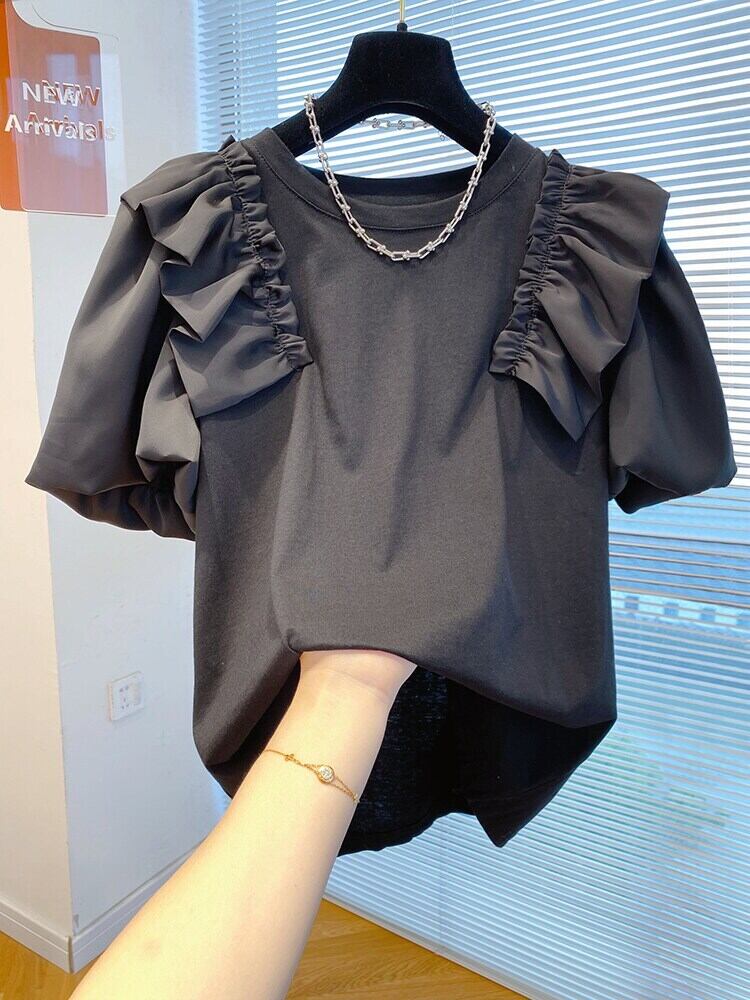 フリル半袖 Tシャツルーズバブルスリーブトップホワイトコットン Tシャツ Camisetas 美的 Tシャツブラック ショート ハーフスリーブ