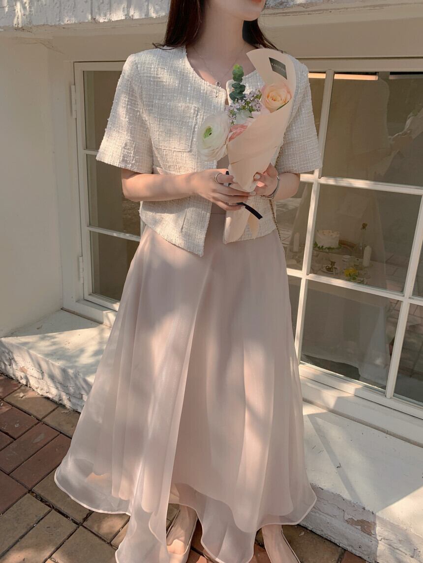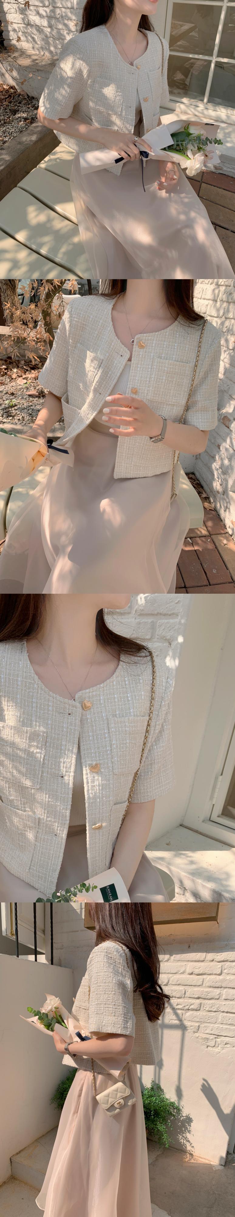 O ネックメタルラブボタンルーズ多用途半袖ツイードコートサマーテルカーディガンチャケータコートスーツ ショート ハーフスリーブ 夏物