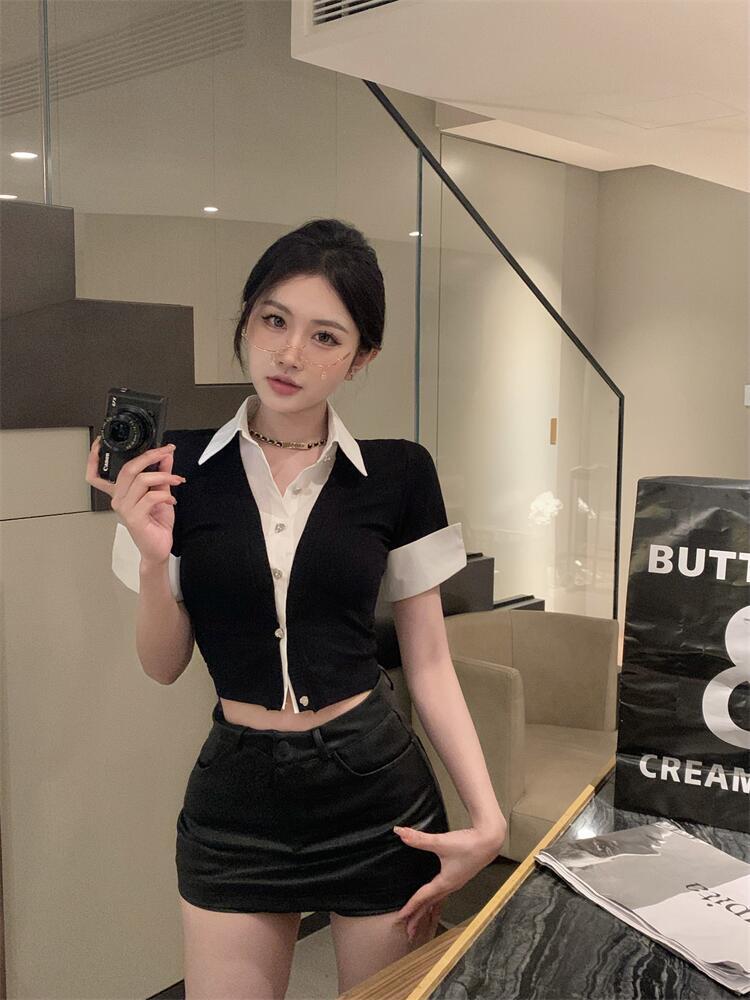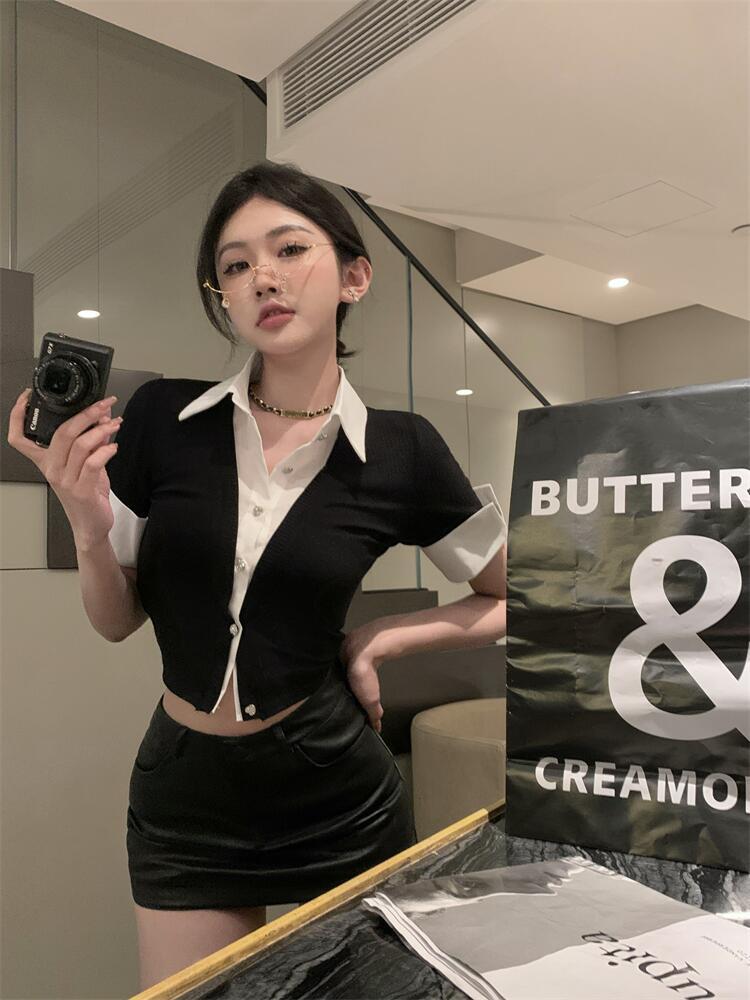 ウエストスリム偽 2 半袖ブラウスセクシー Y2k トップスシャツグレーニット s パッチワークシャツ ショート ハーフスリーブ