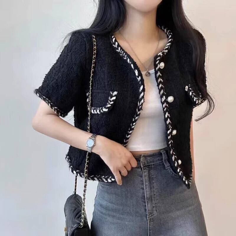作物黒ツイードコート半袖カーディガン夏 Jaquetas チェック柄ジャケット Chaqueta 服 Y2k ショート ブラック ハーフスリーブ サマー 夏物