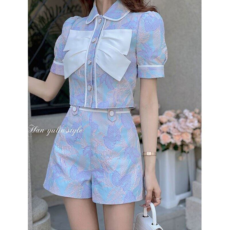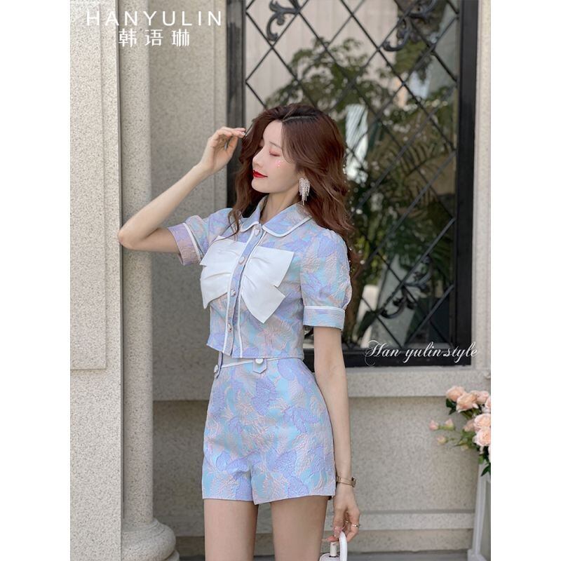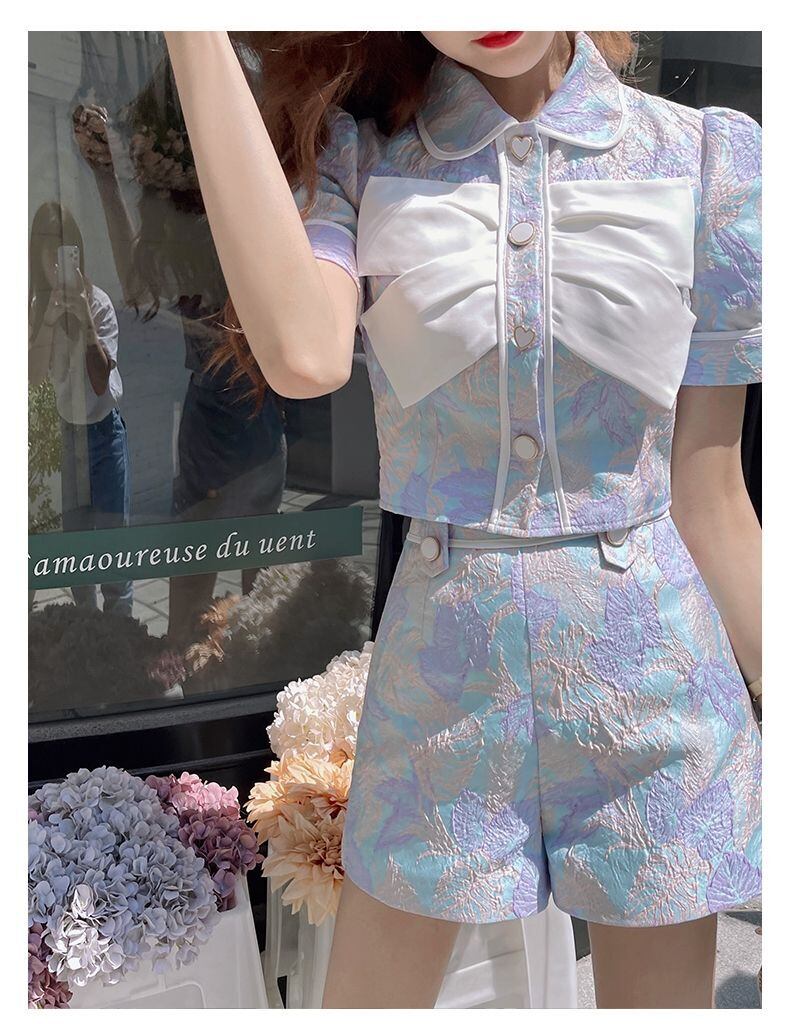 弓クロップトップ花柄シャツジャカードショーツセットワイドレッグツーピースセット衣装ショートパンツスーツ夏 サマー 夏物 ブルマー ワイドパンツ
