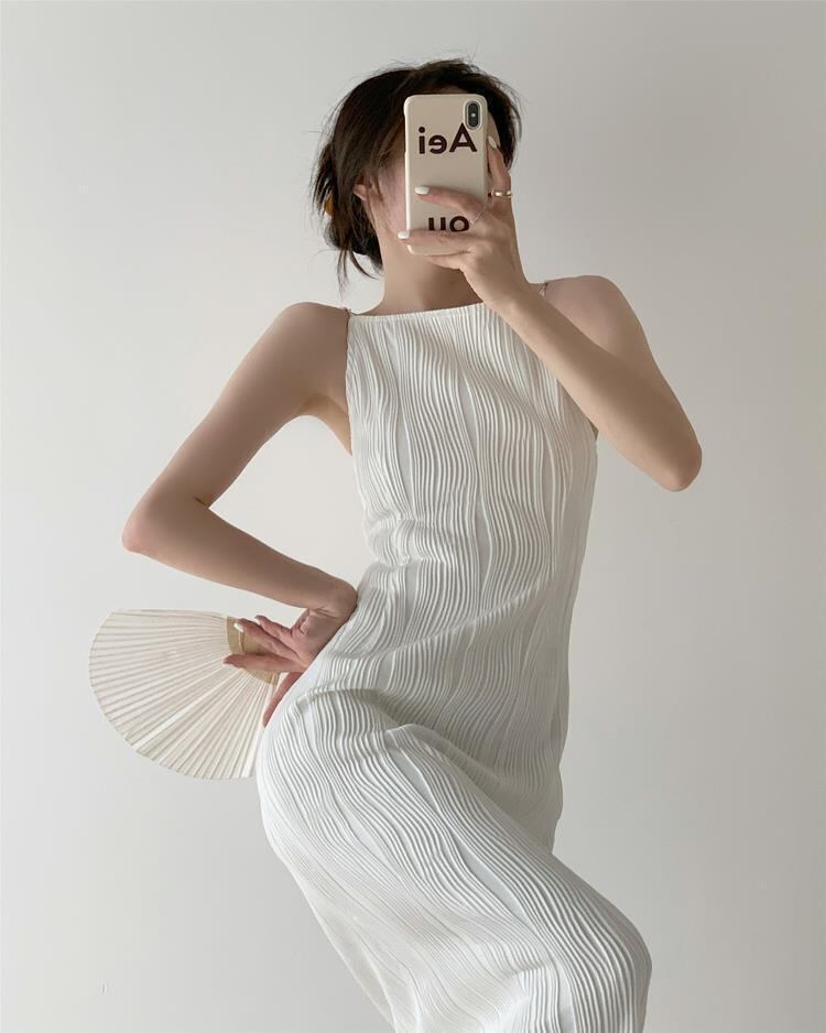 気質キャミソールドレス Vestidos es スリムプリーツウエストパールショルダーストラップボディコン 真珠