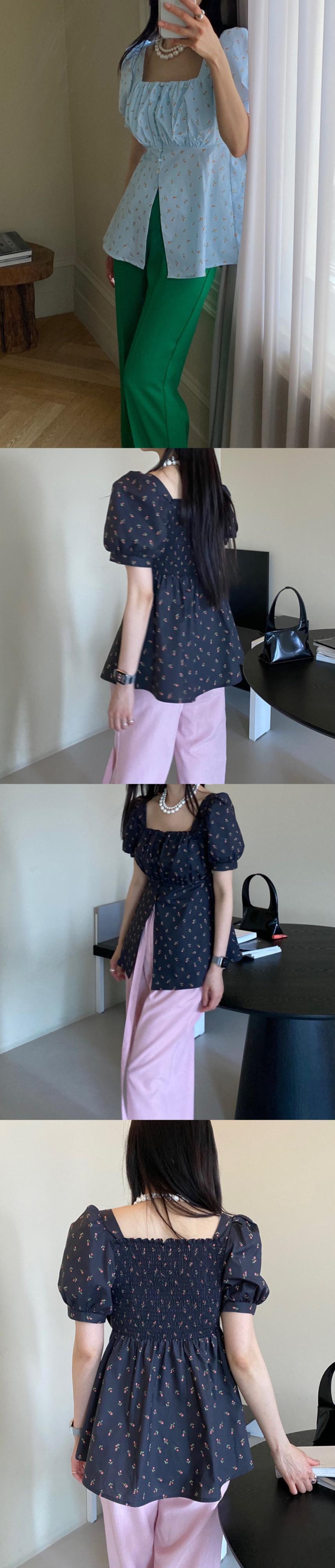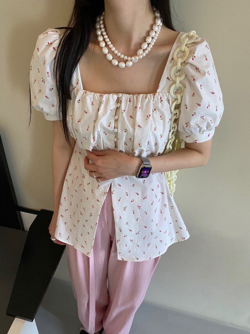 プリーツスタイルスクエアバブル半袖黒花柄シャツトップスリムブラウスシャツ人形シャツ ショート ブラック ハーフスリーブ スクウェア