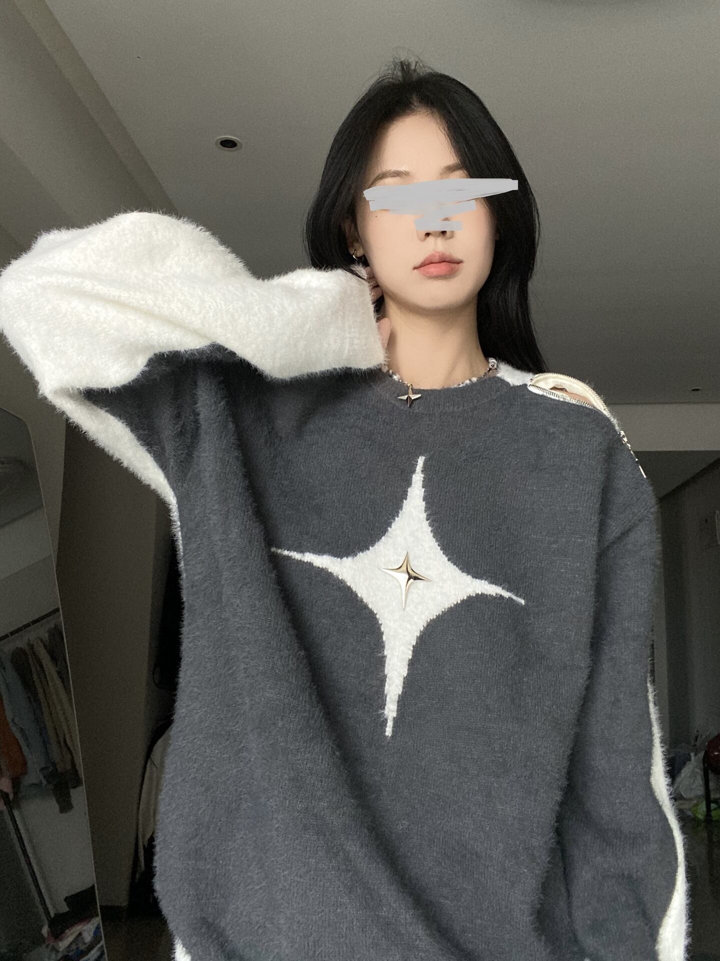 レトロコントラストカラースターセーターセクシースラッシュネックオフショルダー長袖トップス秋原宿 Y2k ジャンパー ロング かわいい オータム 秋物