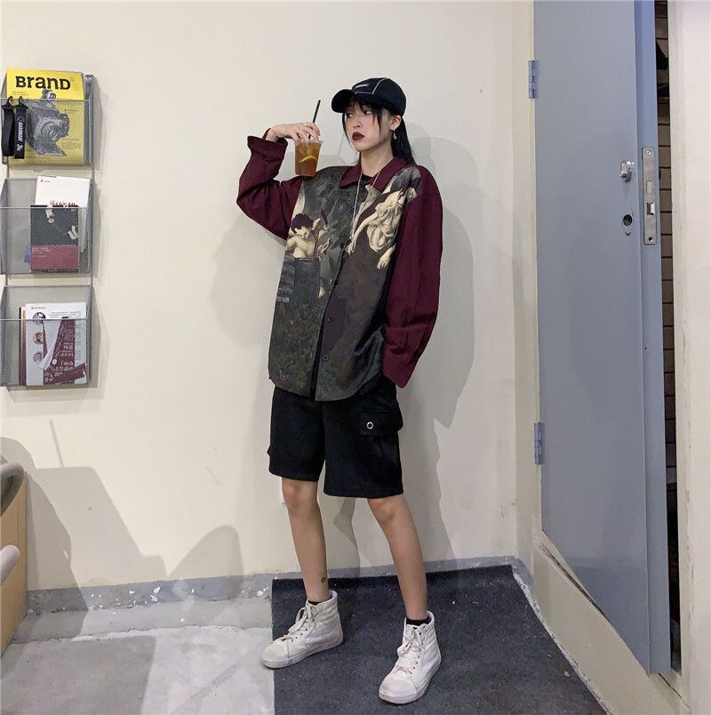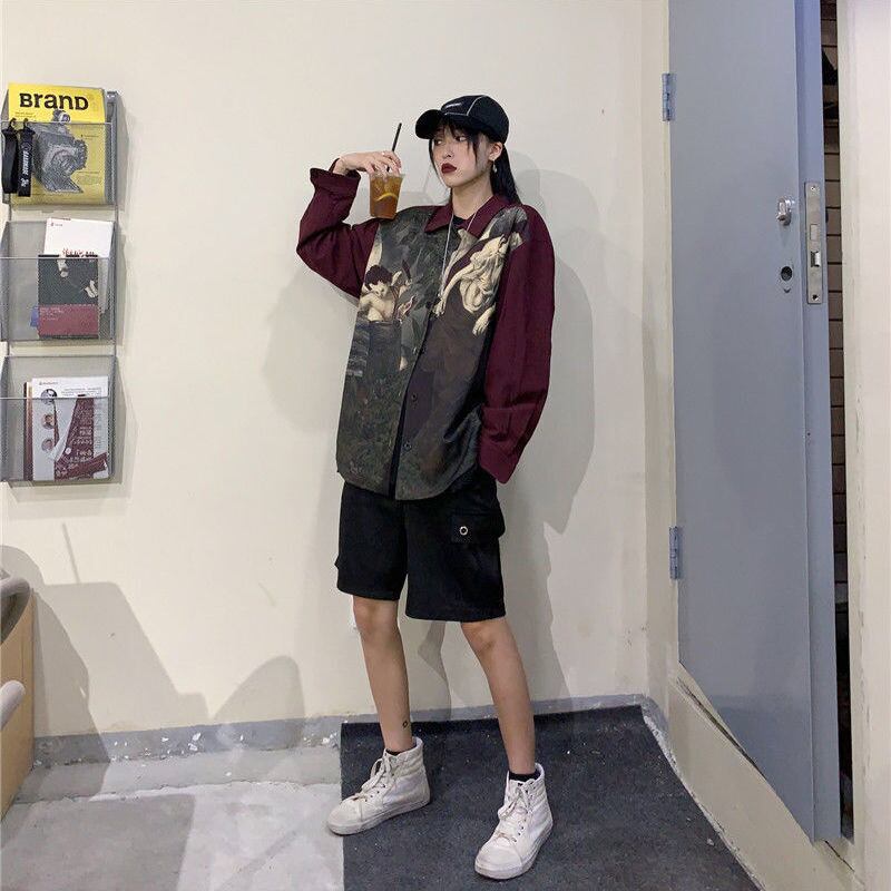 エンジェルプリントブラウスシャツ原宿 ese ストリートカーディガン長袖特大ボタンアップトップス服シャツ ロング かわいい