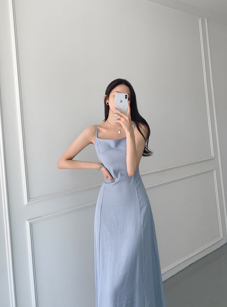気質セクシーブルーキャミソールドレススリムウエスト包帯綿とリネン黒ドレス A ライン Vestidos ブラック コットン Aライン