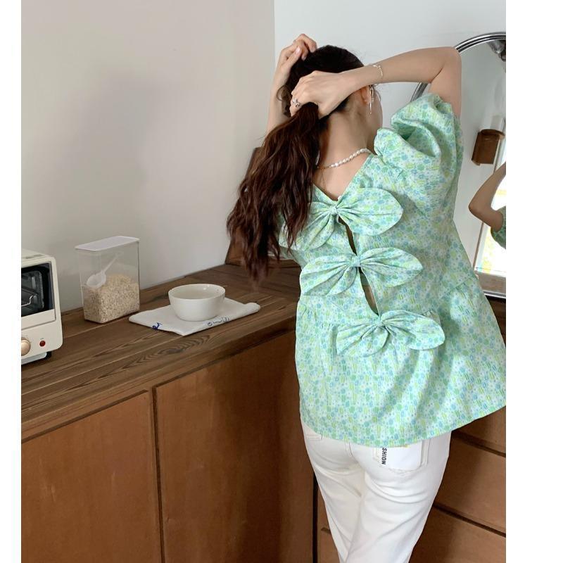ブラウスボウパフスリーブ甘いオールマッチ優しい夏ホットスタイルオル居心地良い人形花 リボン 大人ガーリー スウィート キュート カジュアル サマー 夏物 花柄