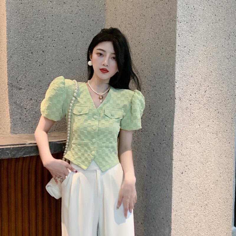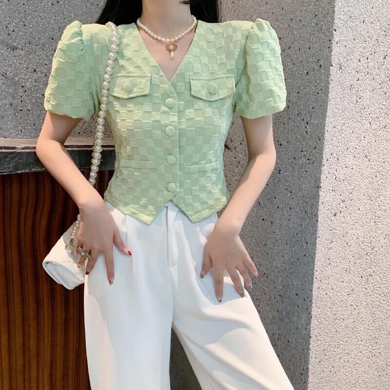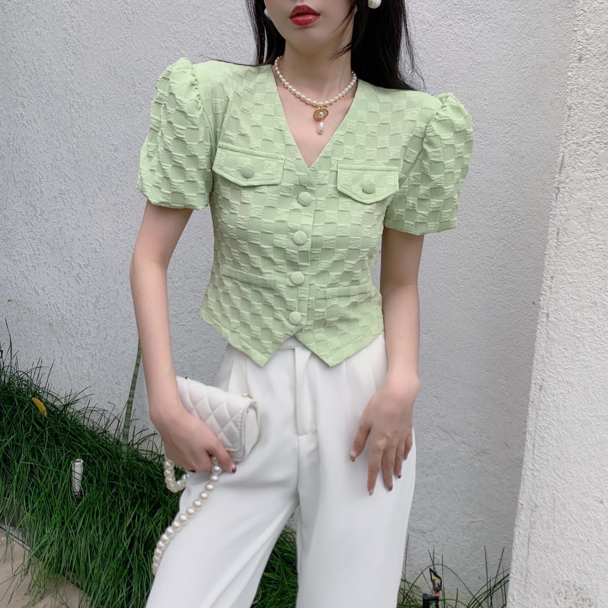 オフィスレディ V 半袖ブラウスグリーンチェッカーボードシャツカーディガンシャツクロップジャケットホワイトトップ ショート ハーフスリーブ 会社 学校 通勤や通学にも