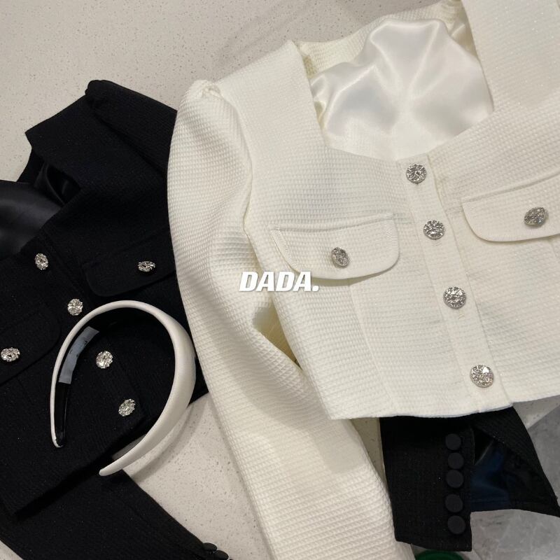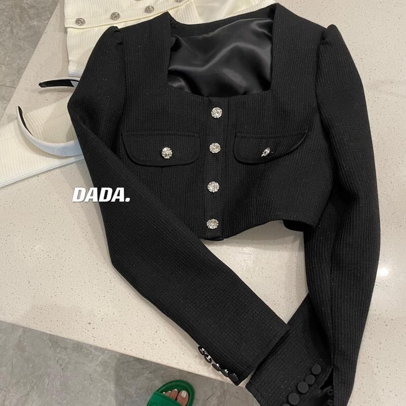 ショートダイヤモンドコート気質トップスクエア長袖チャケータス白チェック柄ジャケットツイードカーディガンクロップ ロング ホワイト スクウェア