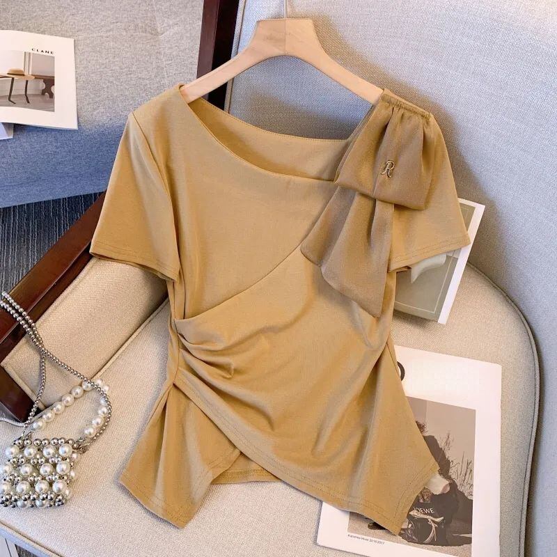 不規則斜め襟半袖 T シャツコットン T シャツ Ropa ブラック T シャツグランジグラフィック Y2k トップ ショート ハーフスリーブ Tシャツ
