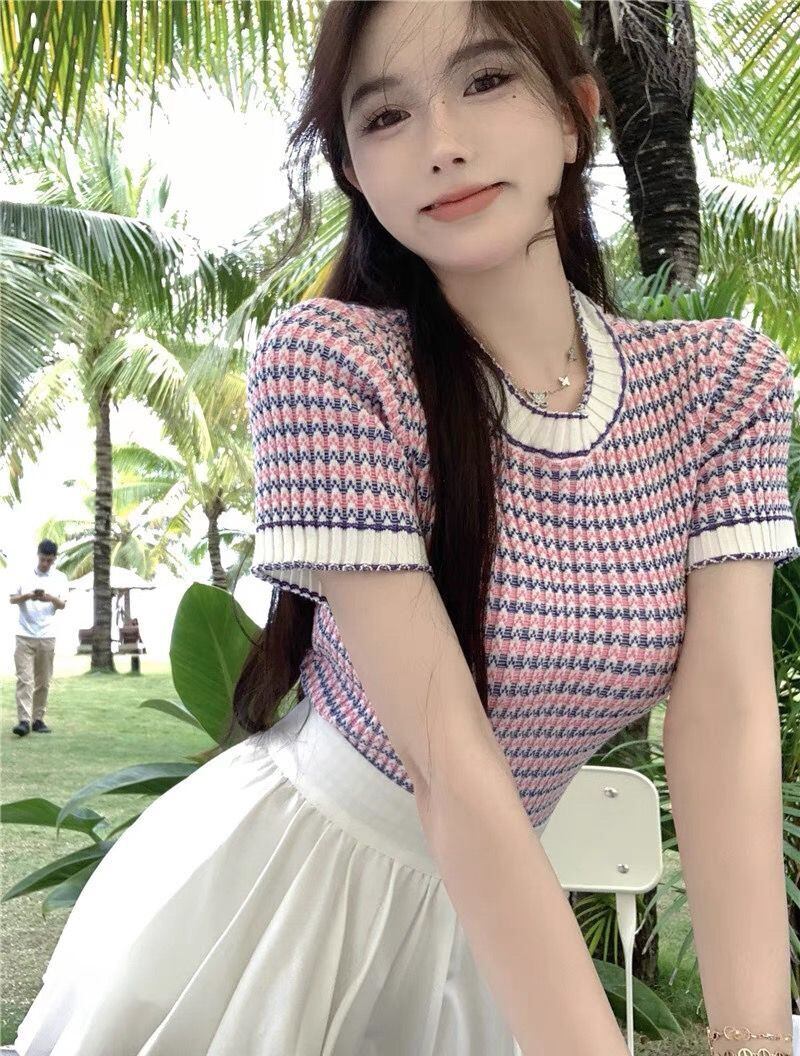 Tシャツ O ネック半袖ニット Tシャツトップスシャツ甘いチュニックニット Tシャツストライプ ショート ハーフスリーブ 大人ガーリー スウィート キュート カジュアル Oネック