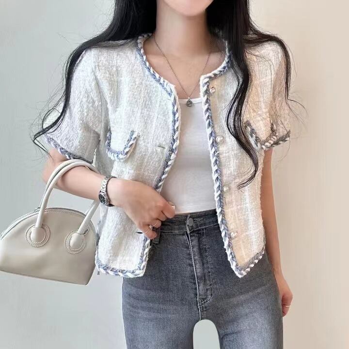 気質夏ショートツイードコートチェック柄カーディガン袖チャケータブラックホワイトスーツジャケットスタイル サマー 夏物
