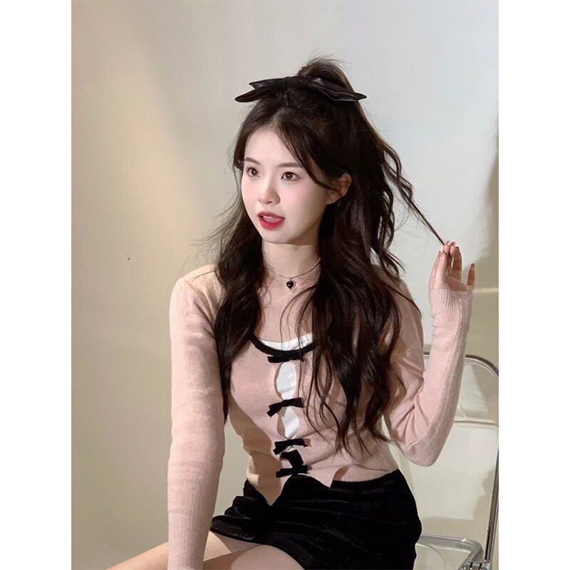 秋ちょう結びカーディガンタンクトップ 2 枚セット Y2k O ネック中空長袖甘いスーツシャツ ロング リボン 大人ガーリー スウィート キュート カジュアル オータム 秋物 Oネック