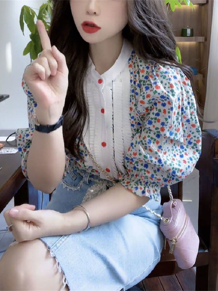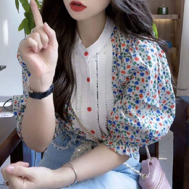 デブラウス O ネックパフスリーブシャツ服花シャツ夏ブラウストップス サマー 夏物 花柄 Oネック