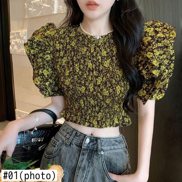 De Moda セクシー花柄ブラウスプリントクロップトップ O ネックフリルサマーシャツスリムシャツシック ラッフル 夏物 Oネック