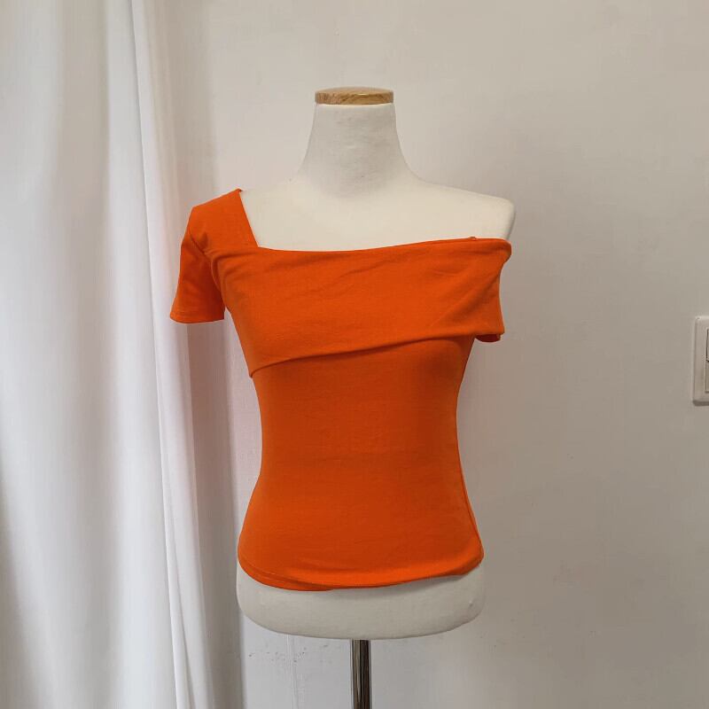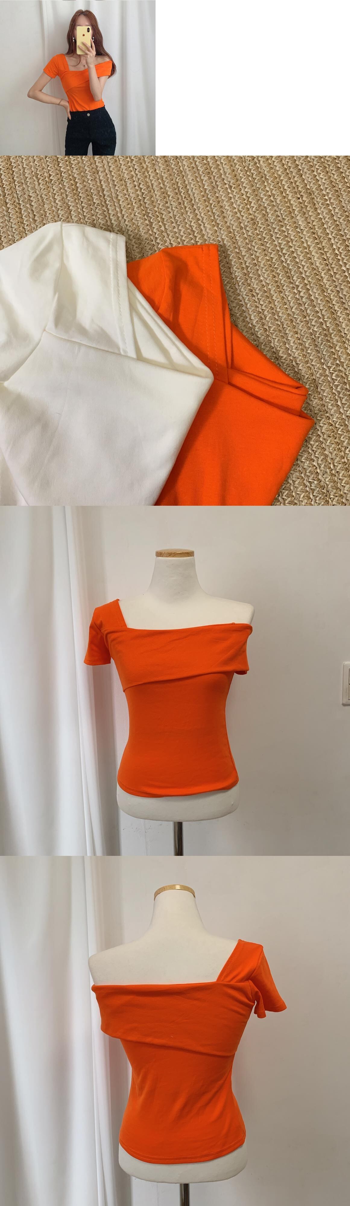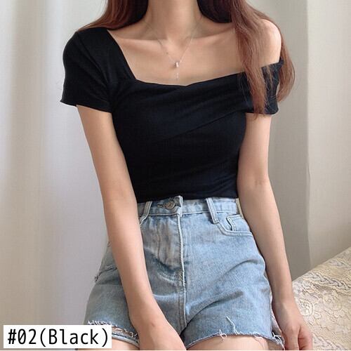 シャツ夏スリム斜め襟不規則半袖 Tシャツトップスラッシュ黒、白 Tシャツコットンクロップ Tシャツ ショート ホワイト ブラック ハーフスリーブ サマー 夏物