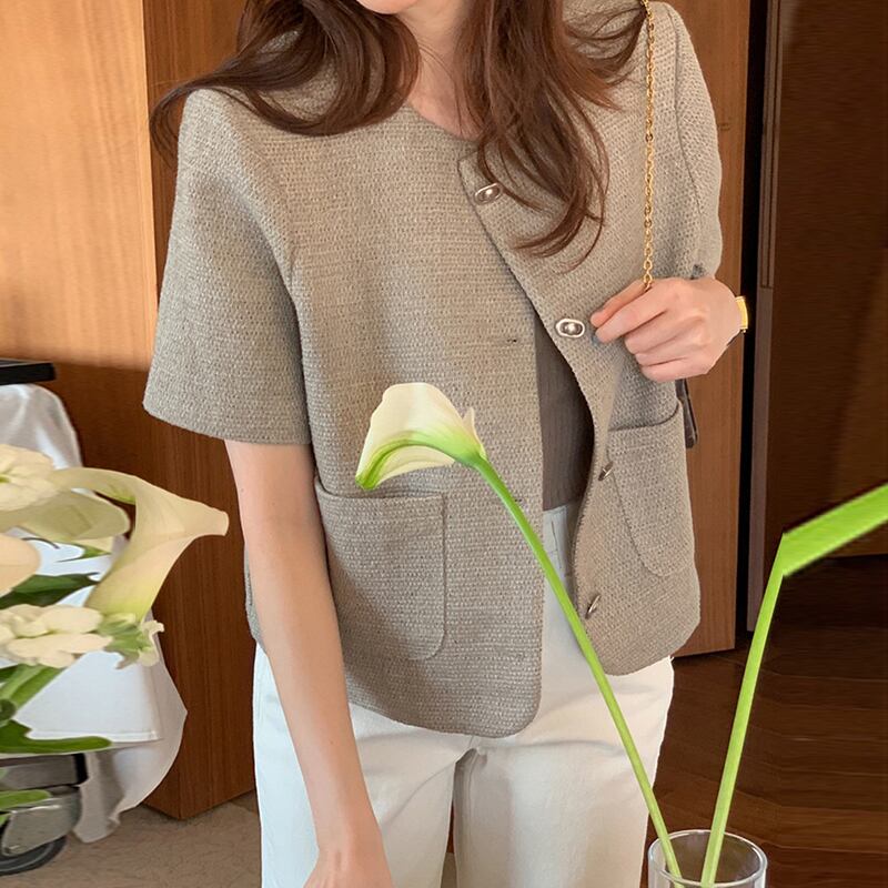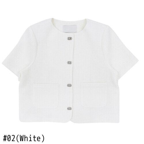 ジャケット O ネックシングルブレストダブルポケットルーズ半袖ツイードコート白スーツ ショート ホワイト ハーフスリーブ Oネック