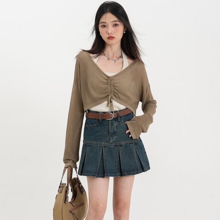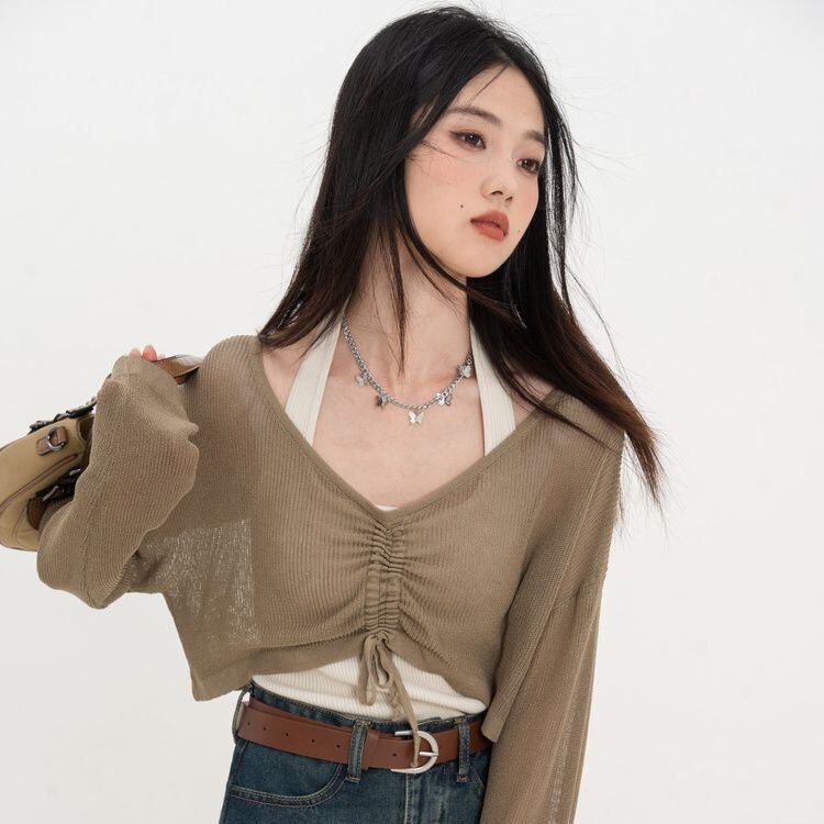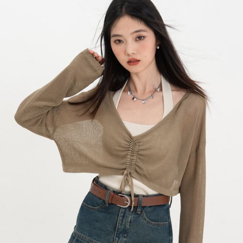 長袖ニット Tシャツキャミソールセクシータンクトップスキャミソールホルターシャツ Y2k カーキ作物セーター 2 セットグランジ ロング