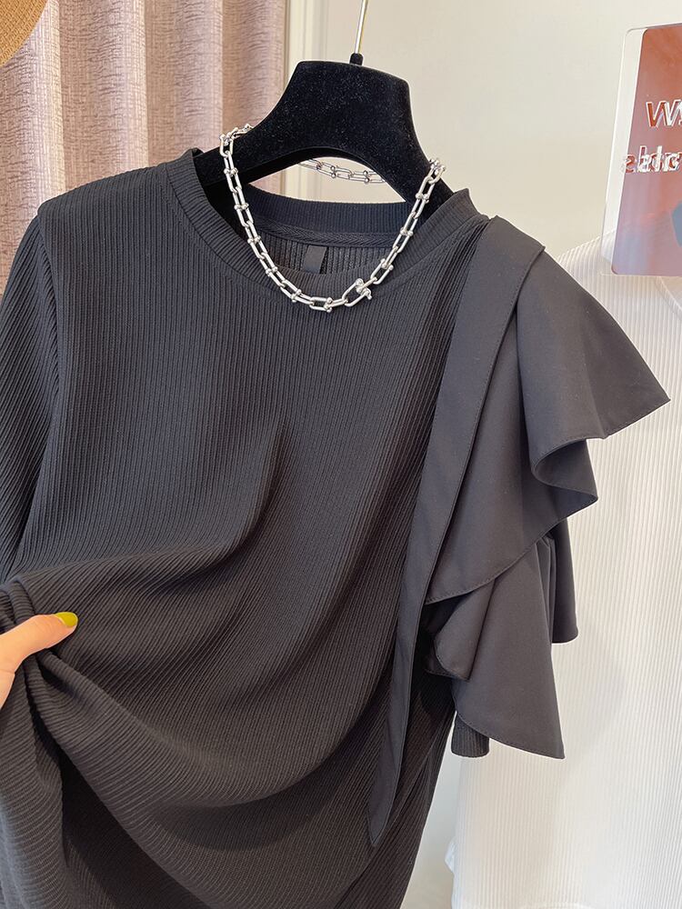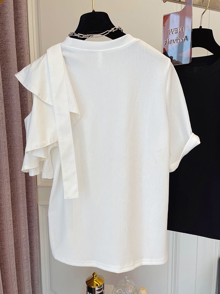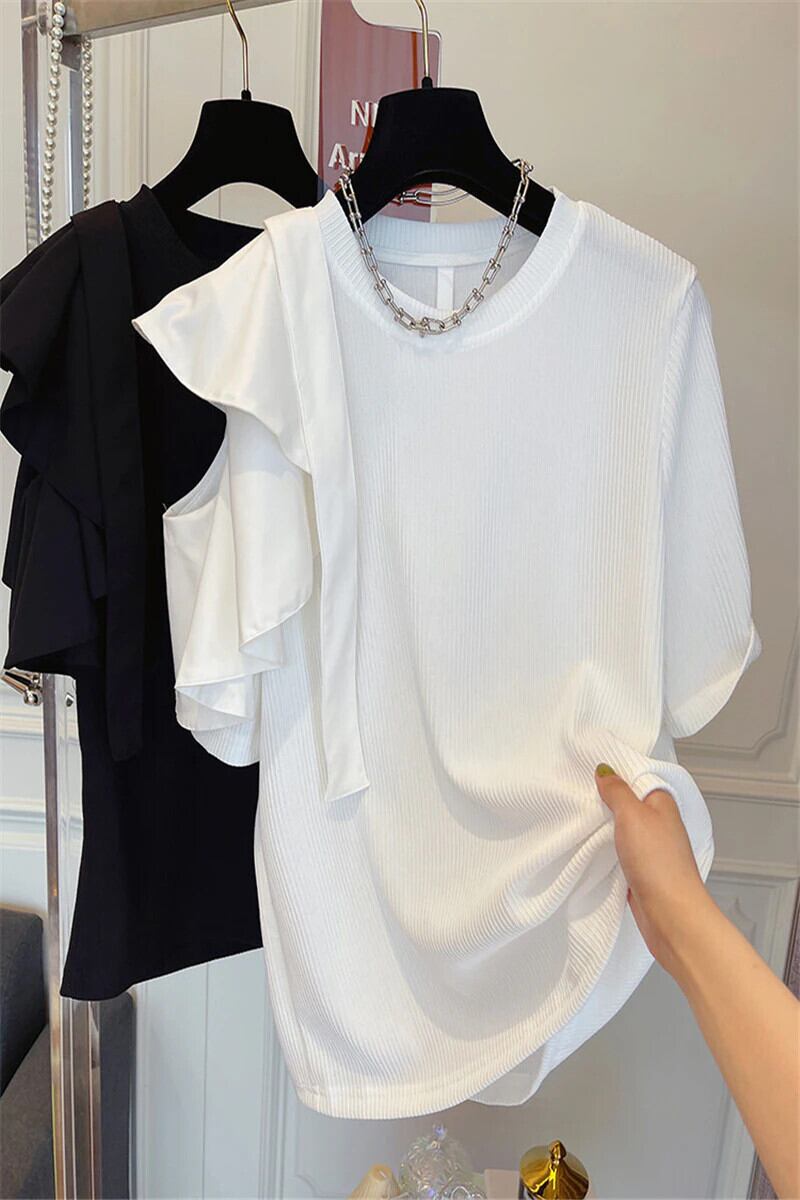 半袖サマートップルーズフリル袖パッチワーク Tシャツコットンブラックグラフィック Tシャツ Tシャツ Ropa ショート ハーフスリーブ 夏物