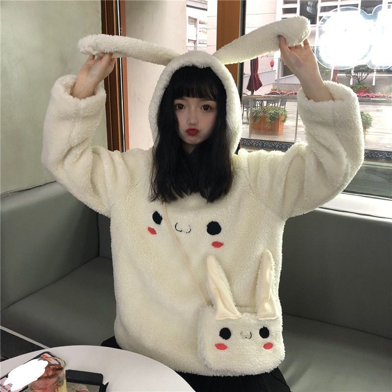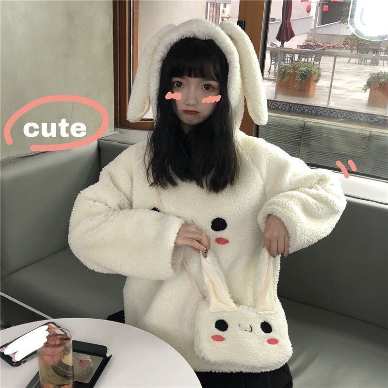 かわいいウサギ耳トレーナーぬいぐるみ厚いフード付きプルオーバー長袖ジャケットフリース服 Y2k パーカートップス Sudaderas ロング 大人ガーリー スウィート キュート カジュアル