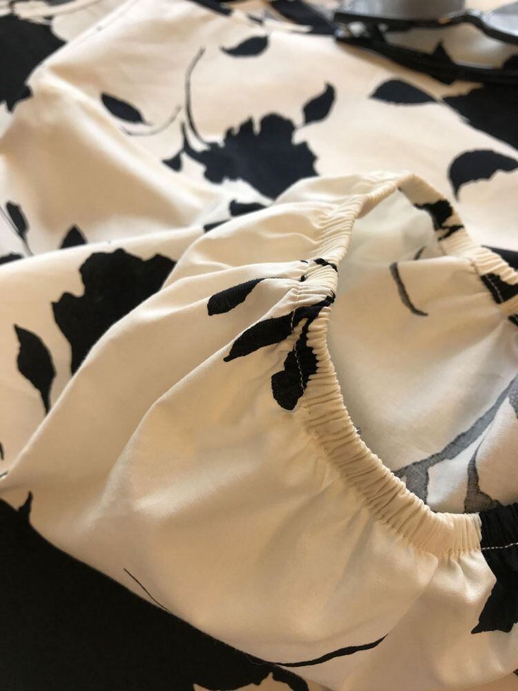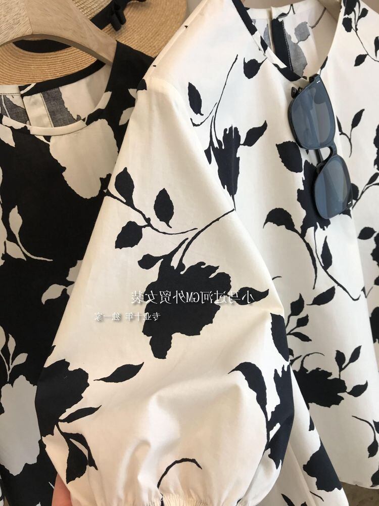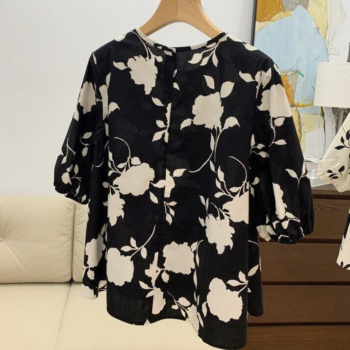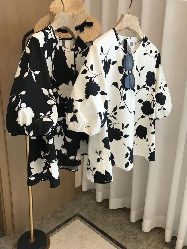オーバーサイズ ブラウス半袖黒白プリント シャツ ショート es 花トップ ホワイト ブラック ハーフスリーブ 花柄