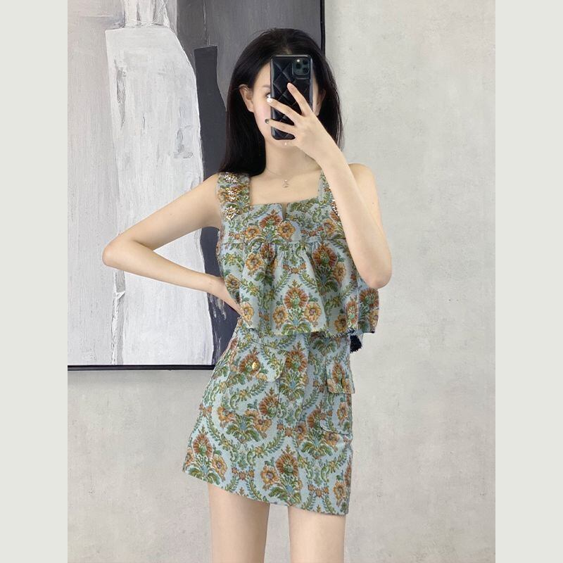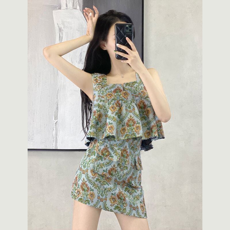 トップス Tシャツ タンクセクシー花柄キャミソール作物夏ベストスカートセット 2 点セットレディース衣装人形ブラウスプリントシャツ サマー 夏物