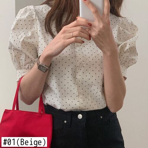 De Moda O ネック シングルブレスト半袖ポルカ ドット シャツ トップ クロップ ブラウス シャツ ショート ハーフスリーブ Oネック