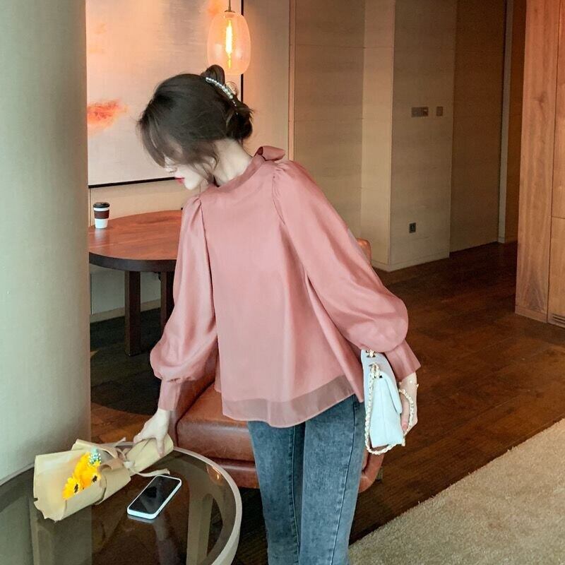 ルーズブラウス秋ランタン 9 分袖リボンレースアップシャツオーガンザシャツホワイト オータム 秋物