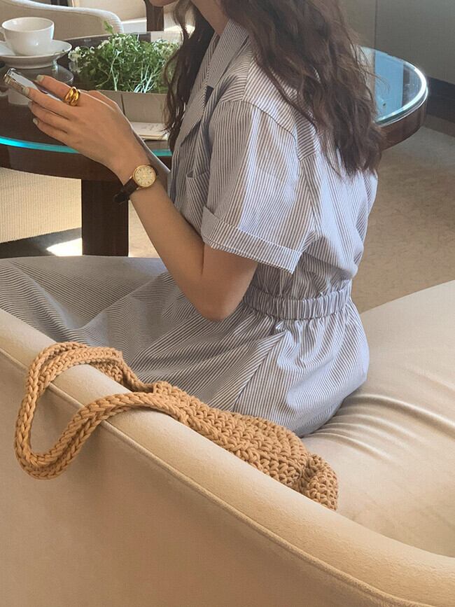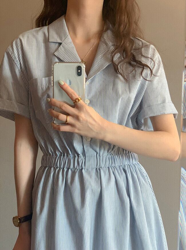 弾性ウエストラペルブルーストライプシャツドレス Vestidos デルーズプレッピースタイルマキシドレス Y2k エラスティック 伸縮
