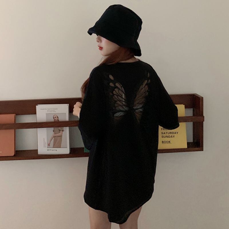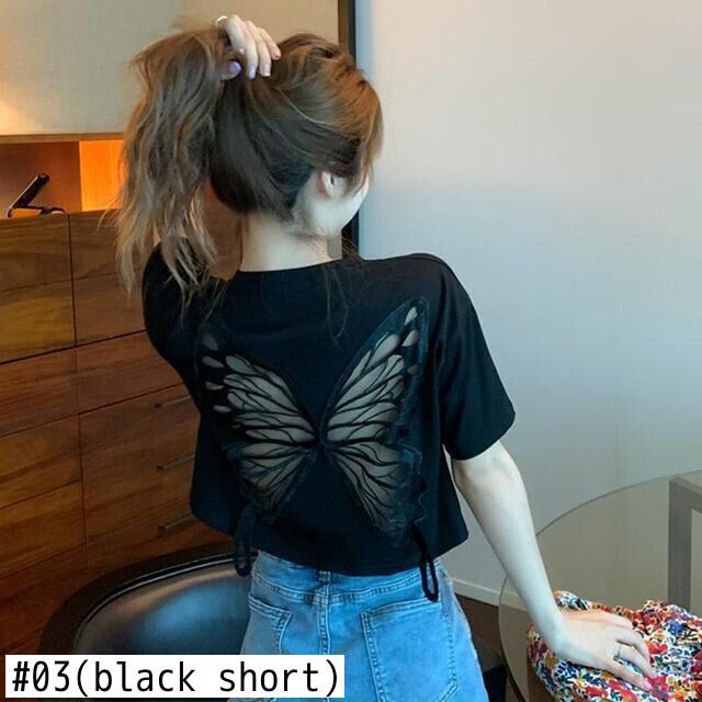 Camisetas コットン Tシャツ Y2k トップスステッチグラフィックシャツ蝶中空オープンバック半袖 Tシャツブラックホワイト ショート ハーフスリーブ
