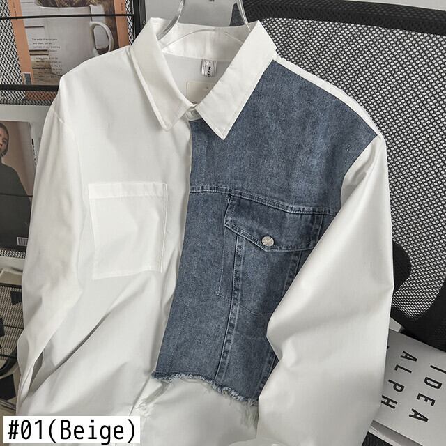 カップルシャツパッチワークシャツ ese ストリートルーズデニムシャツ偽 2 トップス白ブラウス ホワイト