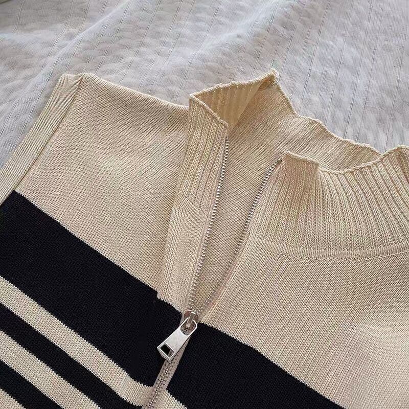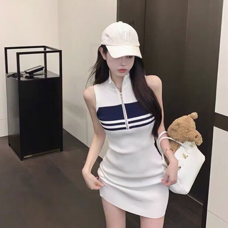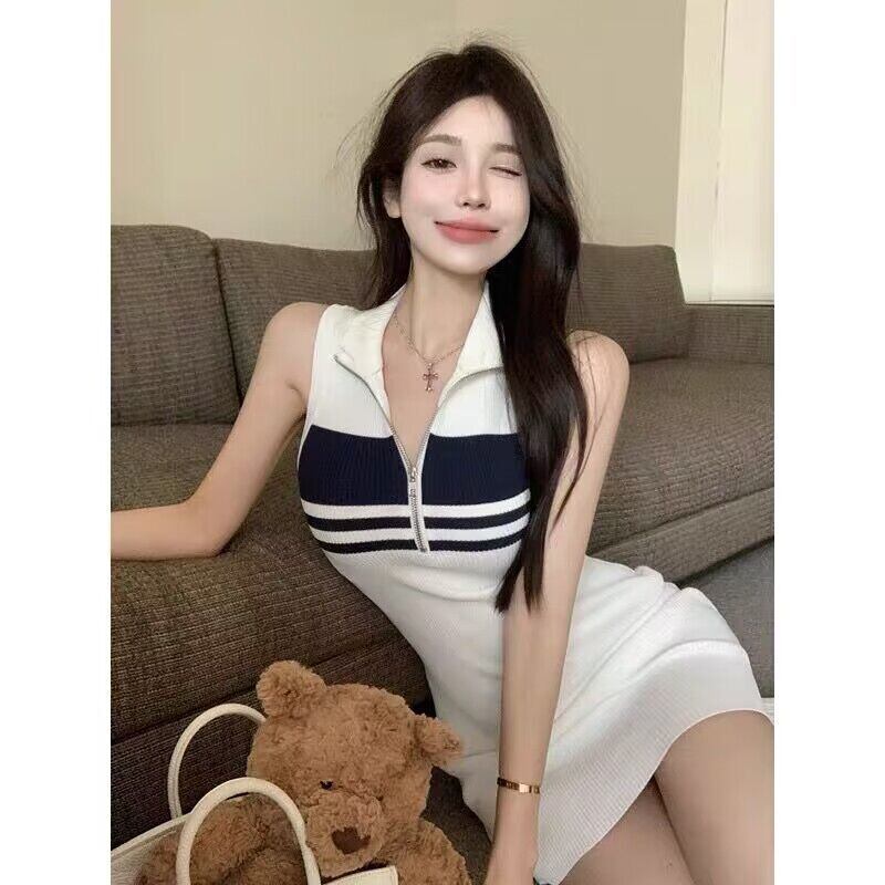 ターンダウン襟ニットドレスノースリーブストライプ印刷 Vestidos 夏ジッパーレディドレスローブ サマー 夏物